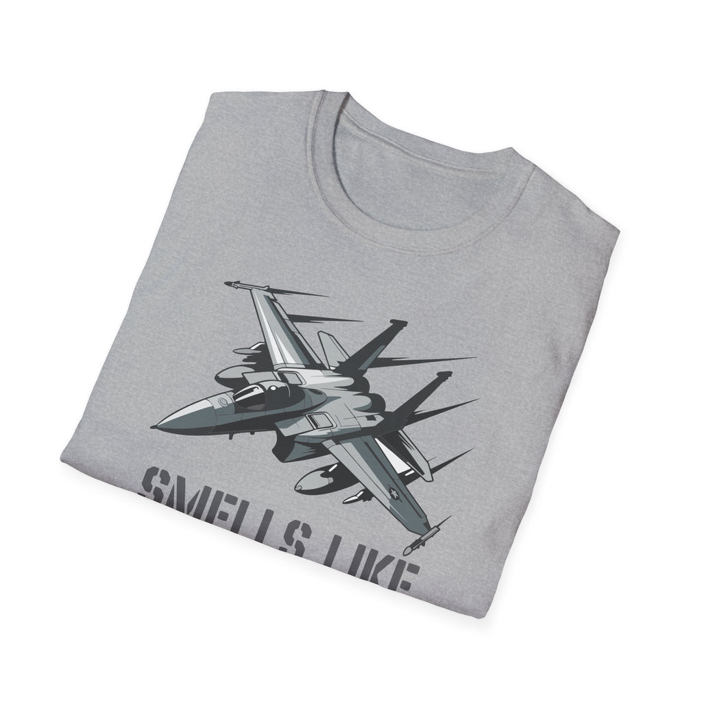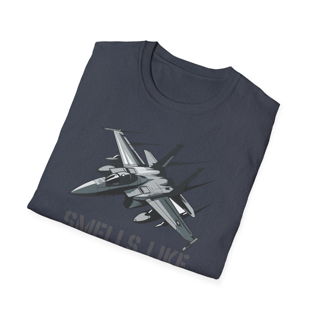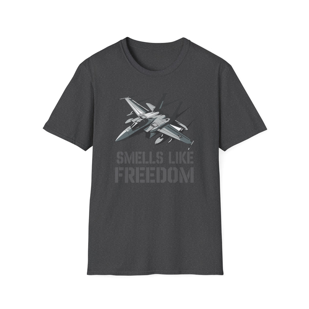 A soft, breathable tee that wears like a memory of wide open skies. The slim-but-classic crew neck and lightweight ring-spun cotton feel cool against the skin while the detailed fighter-jet graphic and subtle "Smells Like Freedom" lettering make a low-key, proud statement. It layers easily under a jacket for early morning runs or stands alone at backyard barbecues and air show weekends. The fabric's smooth hand and tear-away label keep focus on comfort so you can move, salute, or relax without distraction.