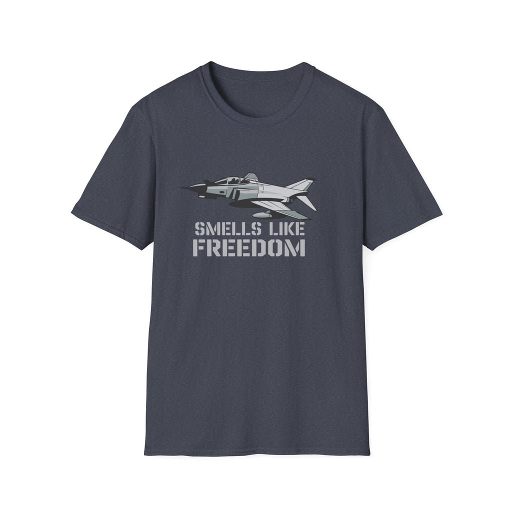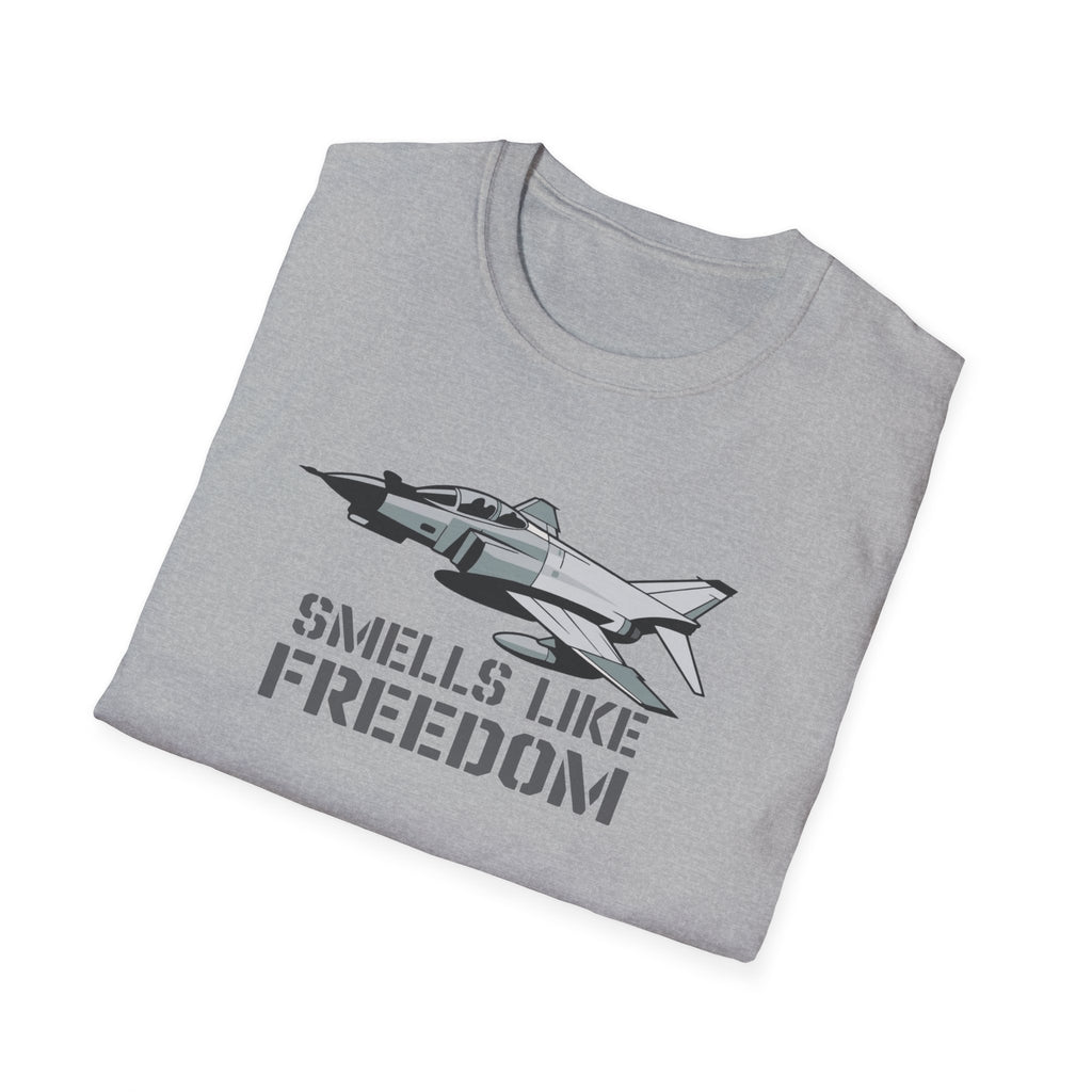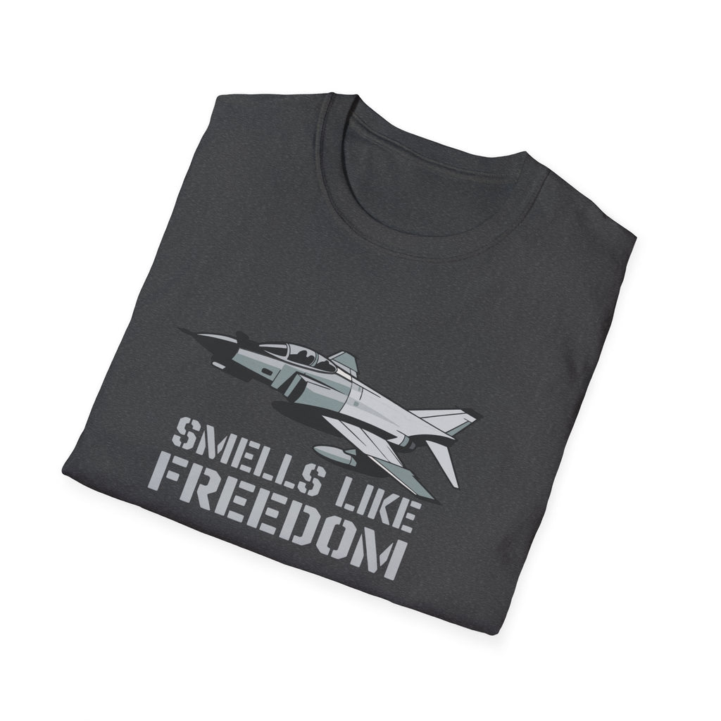 Lightweight, soft, and built for everyday wear — this tee carries a bold aviation graphic and the phrase "SMELLS LIKE FREEDOM" across the chest. The subtle military-gray palette and stencil-style lettering give it a rugged, straightforward attitude without shouting. Wear it during weekend flights, casual meetups, or while tuning your own rig; the breathable ring-spun cotton drapes cleanly and keeps you comfortable from dawn patrol to evening hangouts. The design sits centered and confident, an easy nod to pilots, vets, and aircraft lovers who appreciate quiet pride and durable, no-nonsense style.
